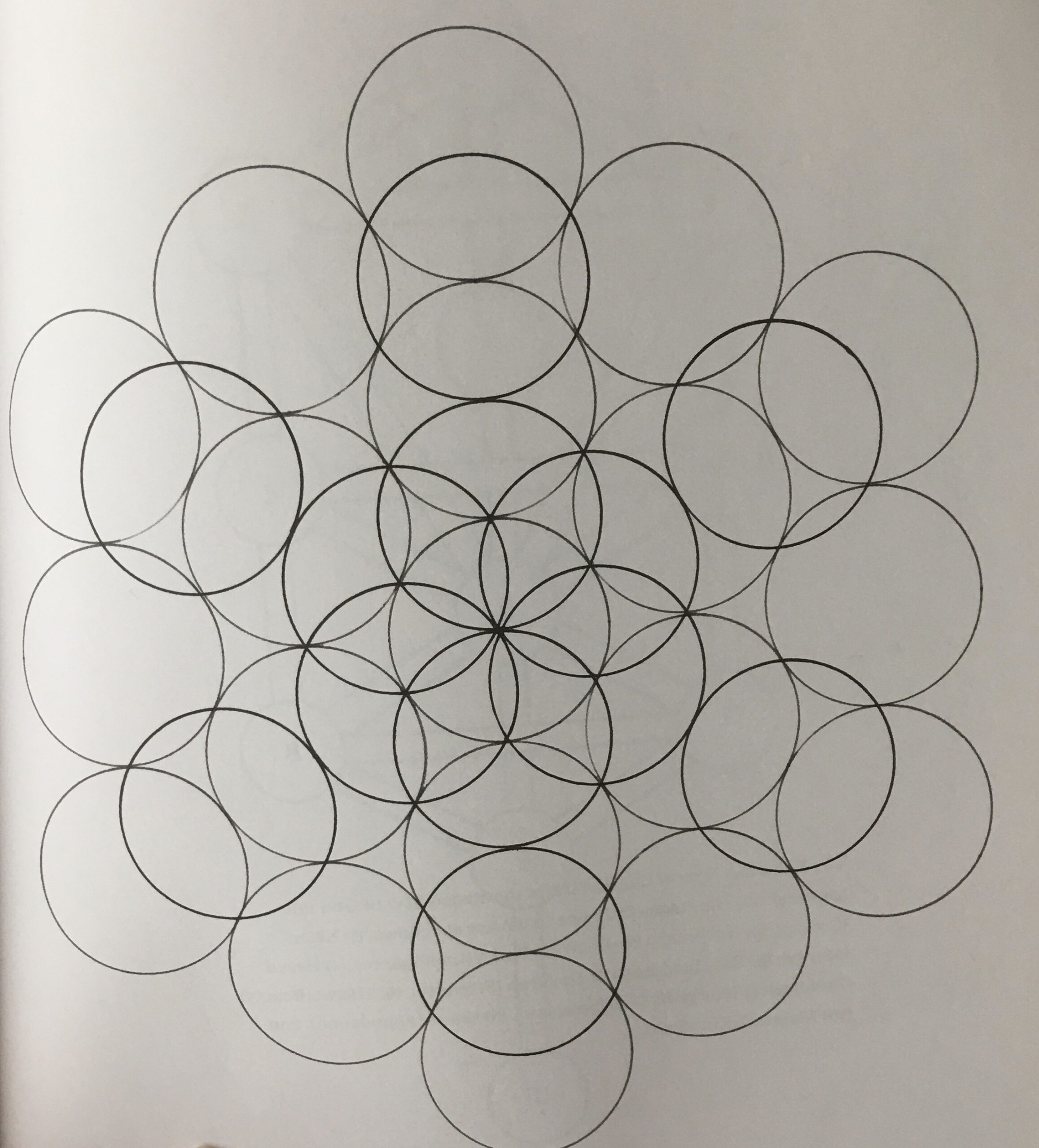 This mandala is based on the flower of life design that I wrote about here. It fascinated me because some of the overlapping lines of the flower of life are missing. I did not see a pattern in which one’s were drawn and which one’s were not. I wanted to explore and find my way. My first couple of attempts resulted in my drawing part of the design which were not in the book. In the sketch below I began focusing on drawing the six overlapping circles that moved outward first then filling in the circles that are added in the fourth round.